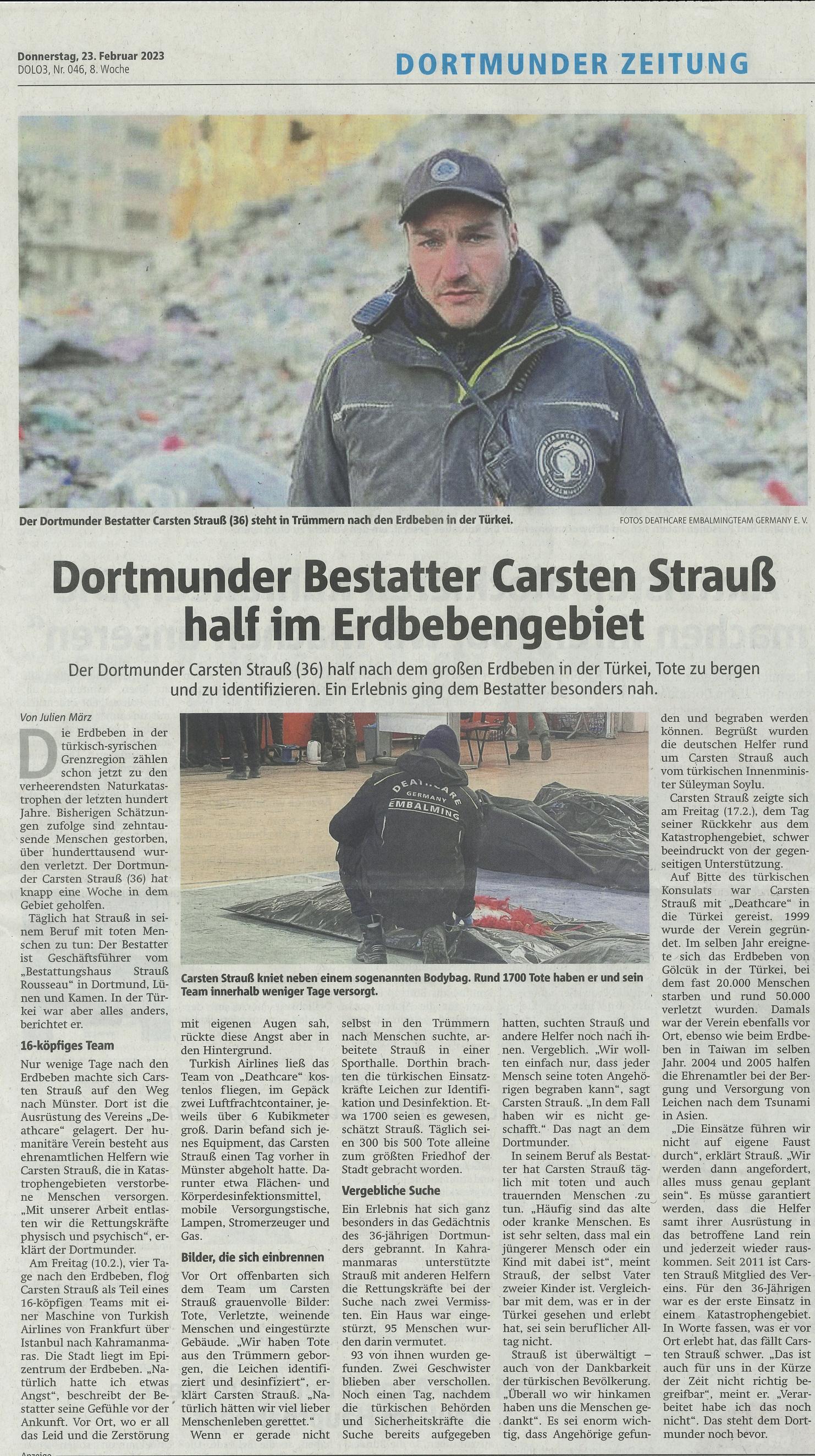 am 10. Februar 2023 machte sich Carsten Strauß mit 13 weiteren Thanatopraktikern und 2 Dolmetschern aus dem Deathcare Embalming Team Germany e.V. auf den Weg in die Türkei,